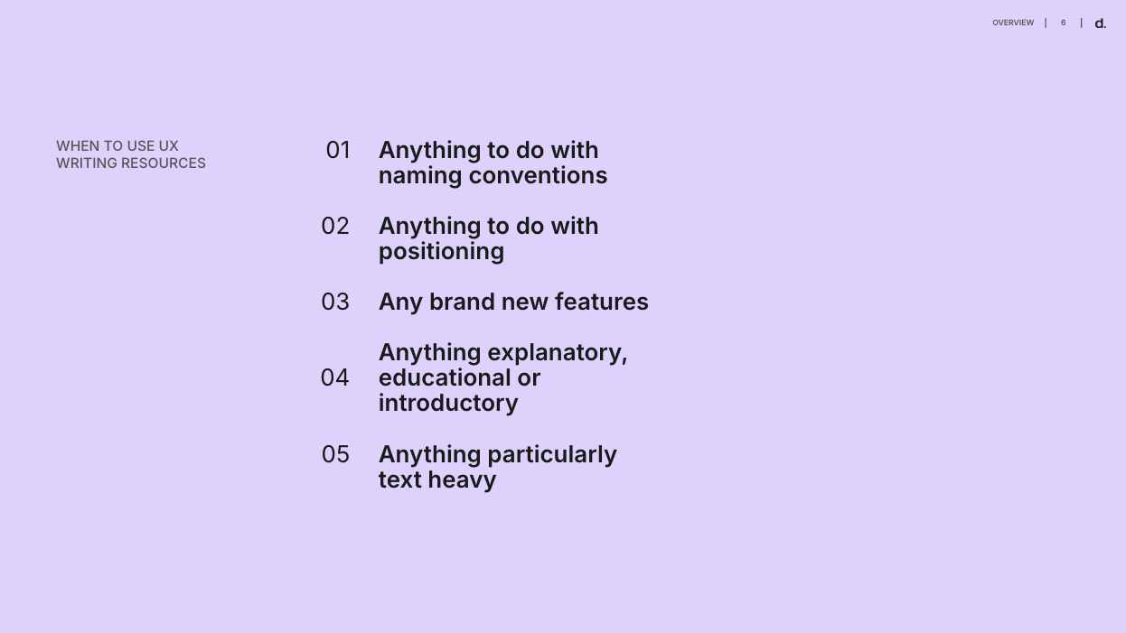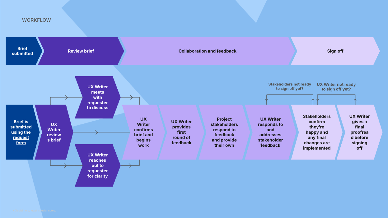 From our UX writing guidelines and content pillars, to workflows and processes, I have led the function and delivered these new initiatives and resources to teams and stakeholders as a one-man department.